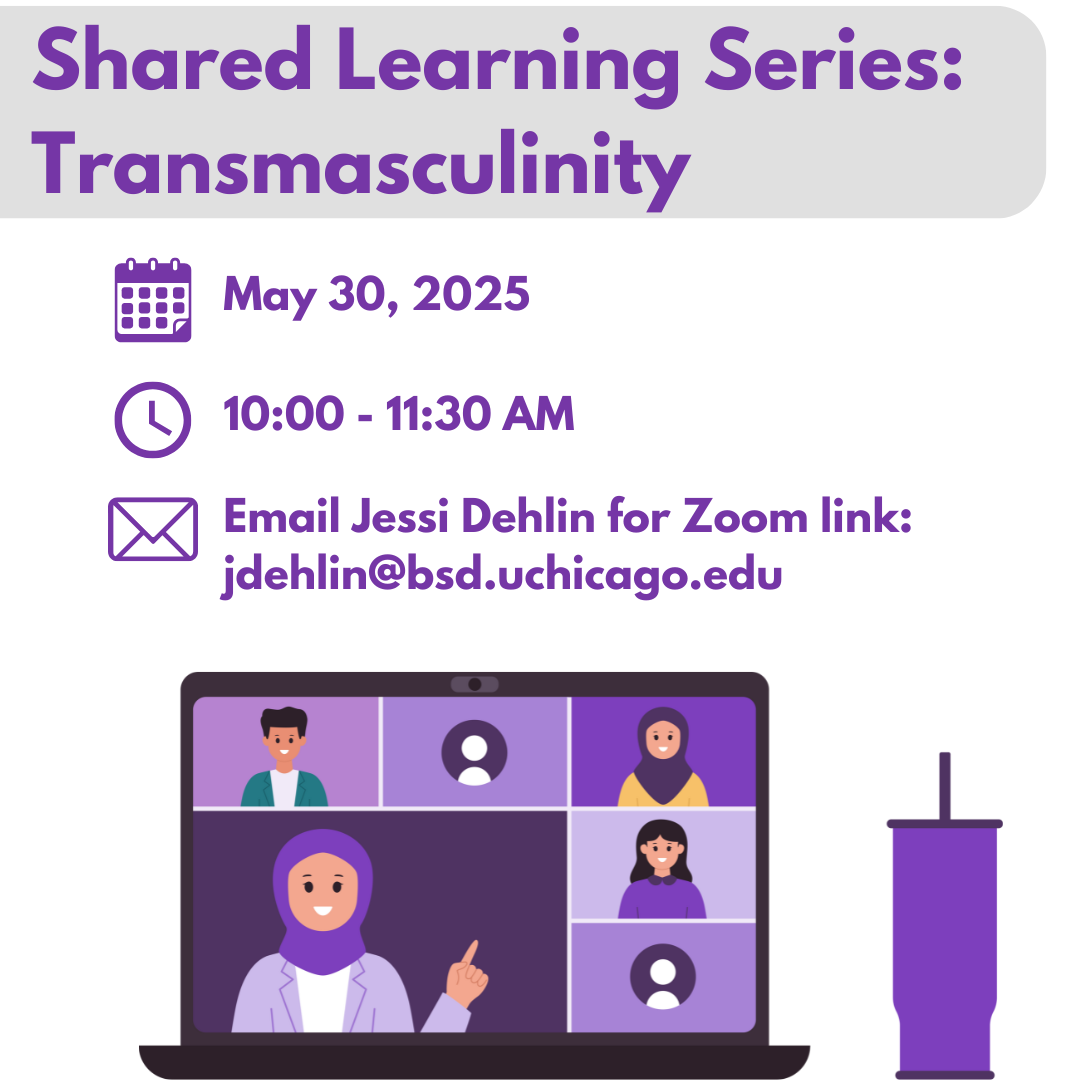 Shared Learning Series: Transmasculinity Friday, May 30, 2025 10:00 AM 11:30 AM Zoom Meeting (map) Google Calendar ICS jdehlin@bsd.uchicago.edu